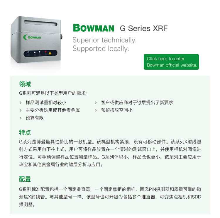 美國博曼(Bowman)擁有超過30年的行業(yè)經驗,是全球鍍層測厚儀及元素分析儀器的領軍品牌。美國博曼 G系列是上罩式機型,與其他機型的區(qū)別是該型號的X射線照射方式采用由上往下的設計,基礎但全面的配置可以滿足鍍層產品的一般測量。美國博曼 G系列是最具性價比的一款臺式測厚儀。