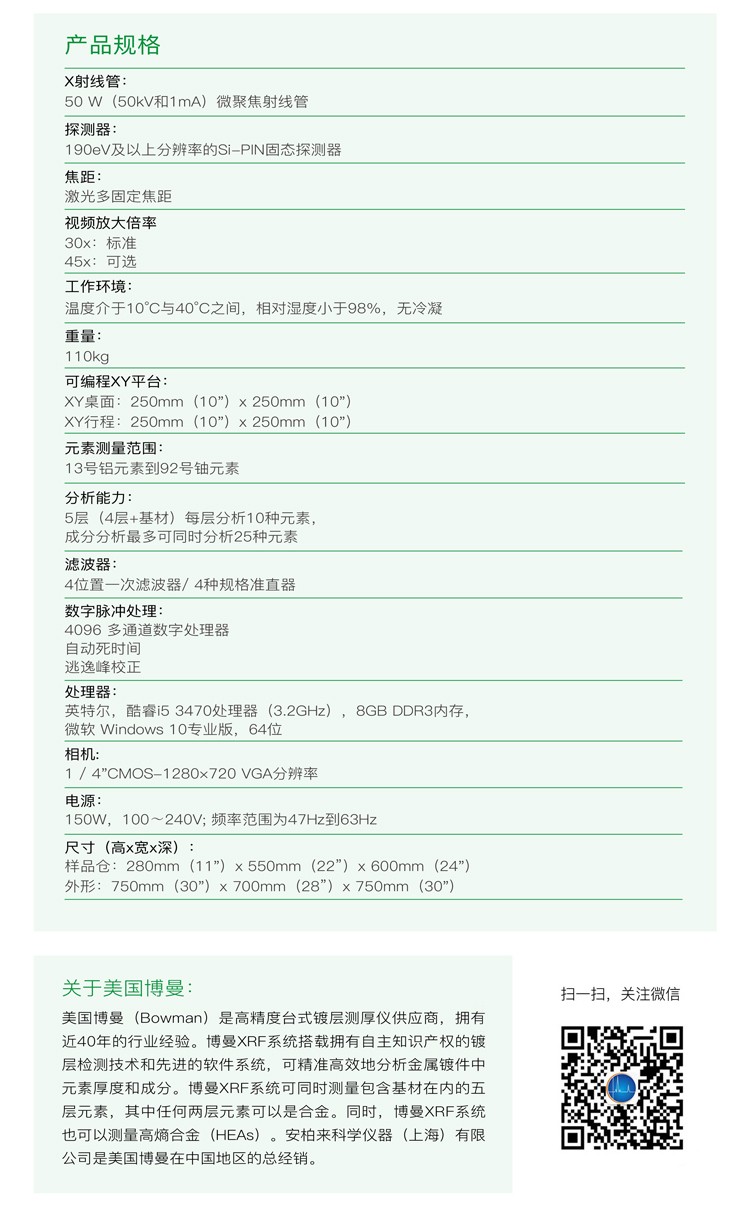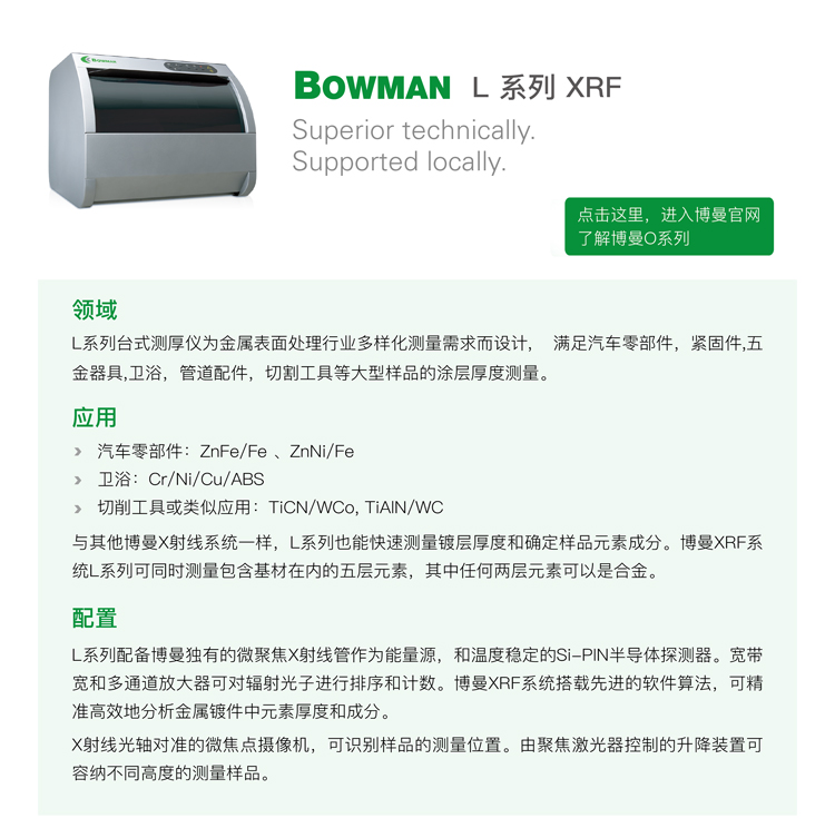 美國(guó)博曼(Bowman)擁有超過(guò)30年的行業(yè)經(jīng)驗(yàn),是全球鍍層測(cè)厚儀及元素分析儀器的領(lǐng)軍品牌。美國(guó)博曼 L系列是大腔體機(jī)型,該機(jī)型樣品倉(cāng)尺寸是常規(guī)機(jī)型的6倍。美國(guó)博曼 L系列尤其適合大型鍍件的檢測(cè)。